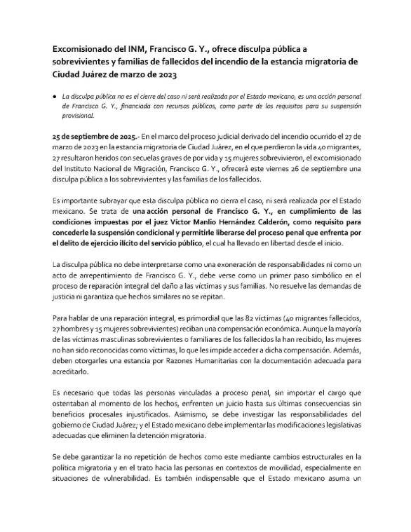 Será este viernes 26 de septiembre cuando en el Museo de la Ciudad de México, Memoria y Tolerancia el ex titular del Instituto Nacional de Migración ofrezca disculpas públicas por el incendio ocurrido en la estación migratoria de Ciudad Juárez, el 27 de marzo de 2023.